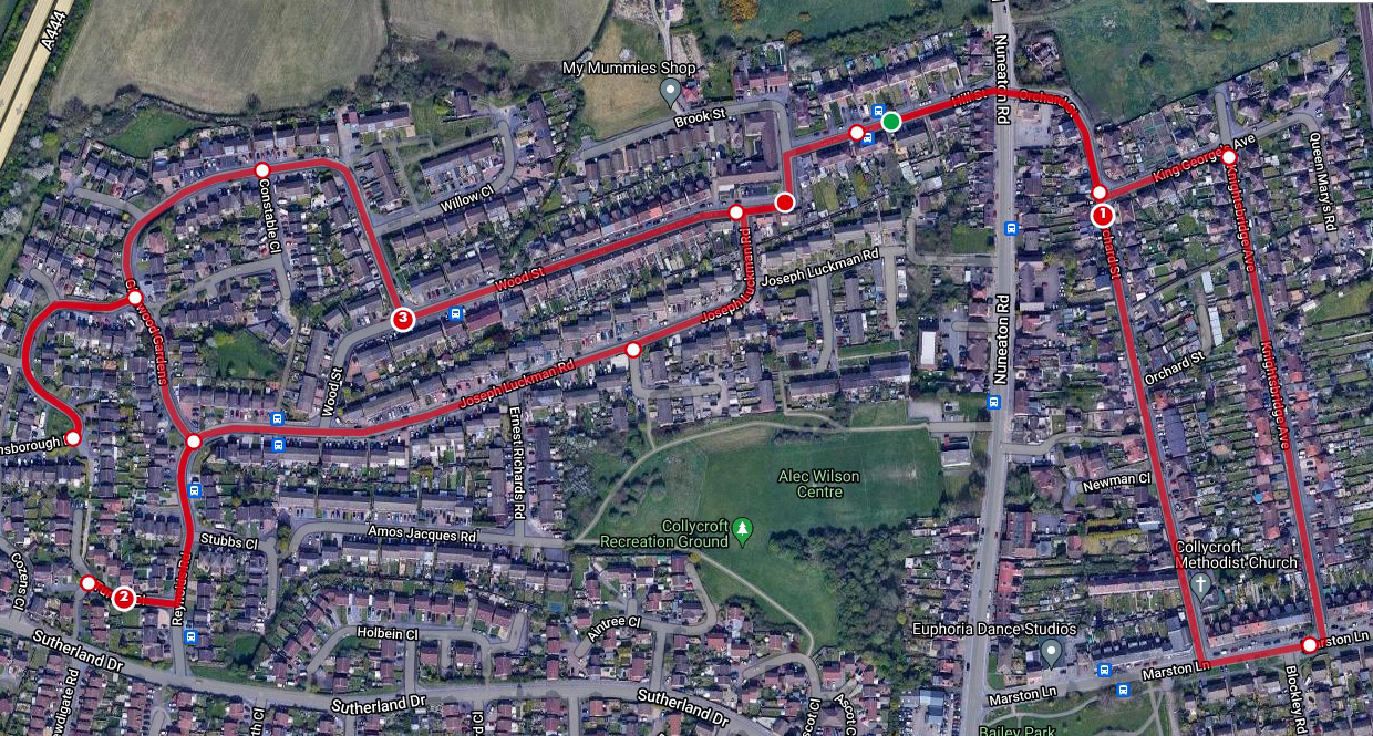 Hill Street, Orchard Street, King George's Avenue, Knightbridge Avenue, Orchard Street, Hill Street, Joesph Luckman Road,