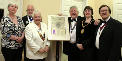 2007 was Bedworth Lions Club's 30th Charter Year; celebrated in the wonderfully modern surroundings of the Windsor Restaurant, at Bede Village. Thanks to to our latest lady Lion Geraldine, who is the community liaison person for the Bede Village complex.Lion President's Wife Jackie Barron, Past District Governor Mike Cooke, District Governor Mavis Cooke, Bedworth Club President Lion Richard Barron, Mayor Cllr Julie Jackson, Mayor's Consort Ian Jackson, Click for more Charter Night Pictures